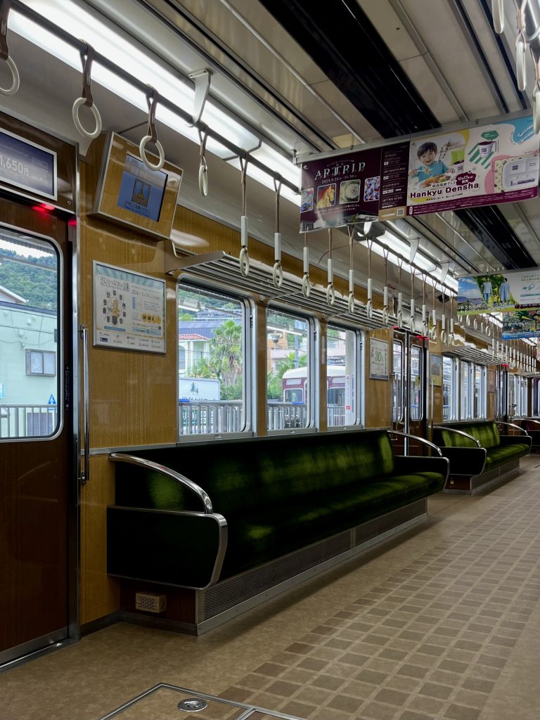 Spannend fand ich außerdem Herrn Okamotos Ausführungen zum öffentlichen Transportsystem in Osaka. Anscheinend gibt es zwischen den Linien eine gewisse Hierarchie, die sich vor allem durch die Blicke ergibt, die man aus den Zügen heraus hat. Linien, die durch „bessere“ Viertel mit „schönerem“ Ausblick fahren, haben den Ruf, von gesellschaftlich anerkannten Schichten genutzt zu werden. Dieser Ruf sei wohl unter anderem ein Argument für die Nutzung der jeweiligen Bahnlinie. Zudem investieren die einzelnen Verkehrsunternehmen in die Attraktivität der angesteuerten Viertel, indem sie Department Stores eröffnen, was nach deutschem Verständnis Kaufhäuser sind. Außerdem interessant ist , dass die Betreiber dieser Bahnlinien vor allem durch den Erwerb von Grundstücken entlang der Strecke – noch vor deren Konstruktion – zu Reichtum gekommen sind. Mit grünen und roten Samtsitzen und einer ästhetischen Retro-Optik ist die Hankyu-Linie meine Lieblingsbahngesellschaft – anbei zwei Fotos davon: